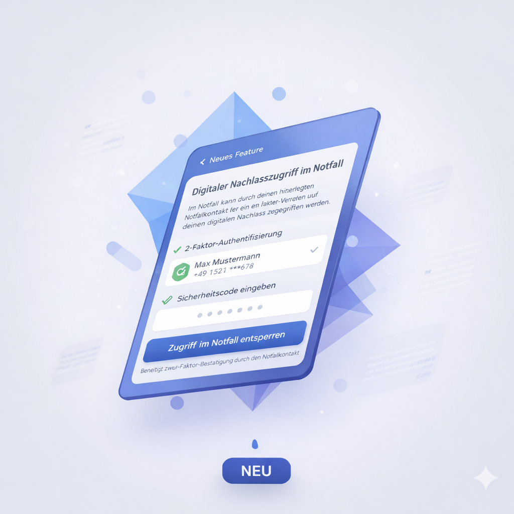 Regle nicht nur finanzielle Angelegenheiten. Stelle sicher, dass Dein hinterlegter Notfallkontakt im Ernstfall digital, sicher und zuverlässig Zugriff auf Deine wichtigsten 2-Faktor-geschützten Konten erhält.